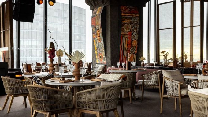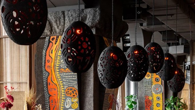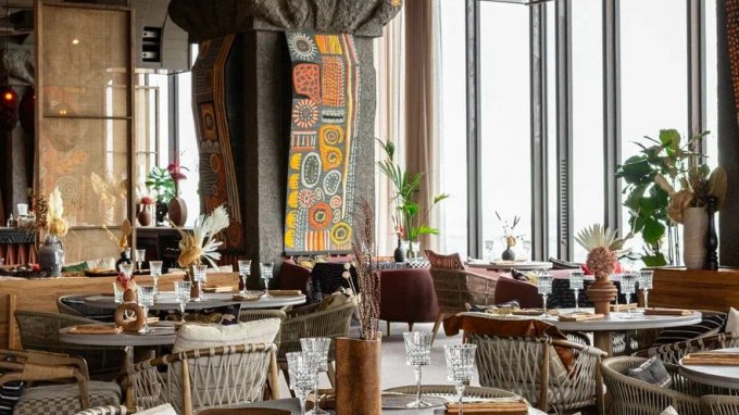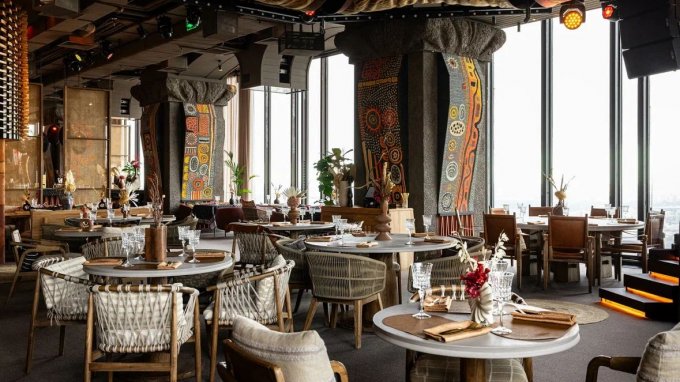 В пространстве ресторана создали интерьер в современном европейском стиле с отсылками к культуре Ближнего Востока. Дизайнеры бюро Artworks выбрали нейтральные природные оттенки, текстиль из льна, дерево и камень. Стены с текстурой глины украсили декором из красных цветов, для освещения развесили плетеные абажуры, на столиках расставили вазочки с композициями из сухоцветов. В посадочной зоне – столы из состаренного дерева, диванчики с текстильной обивкой, оригинальные кресла. Здесь устраивают зажигательные вечеринки с диджей-сетами.